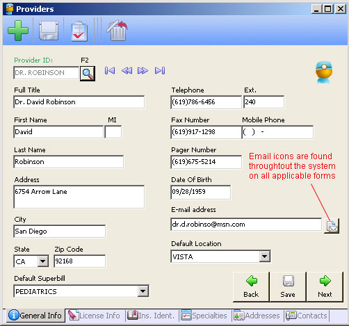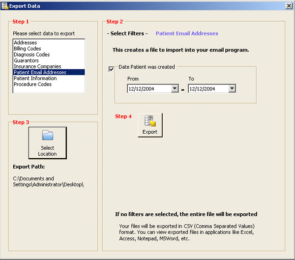 You usually don't even need to export email addresses, since you can email directly from within MedOffice. Each patient, provider, insurance, and guarantor record contains an icon that lets you email immediately (once you have the email address).